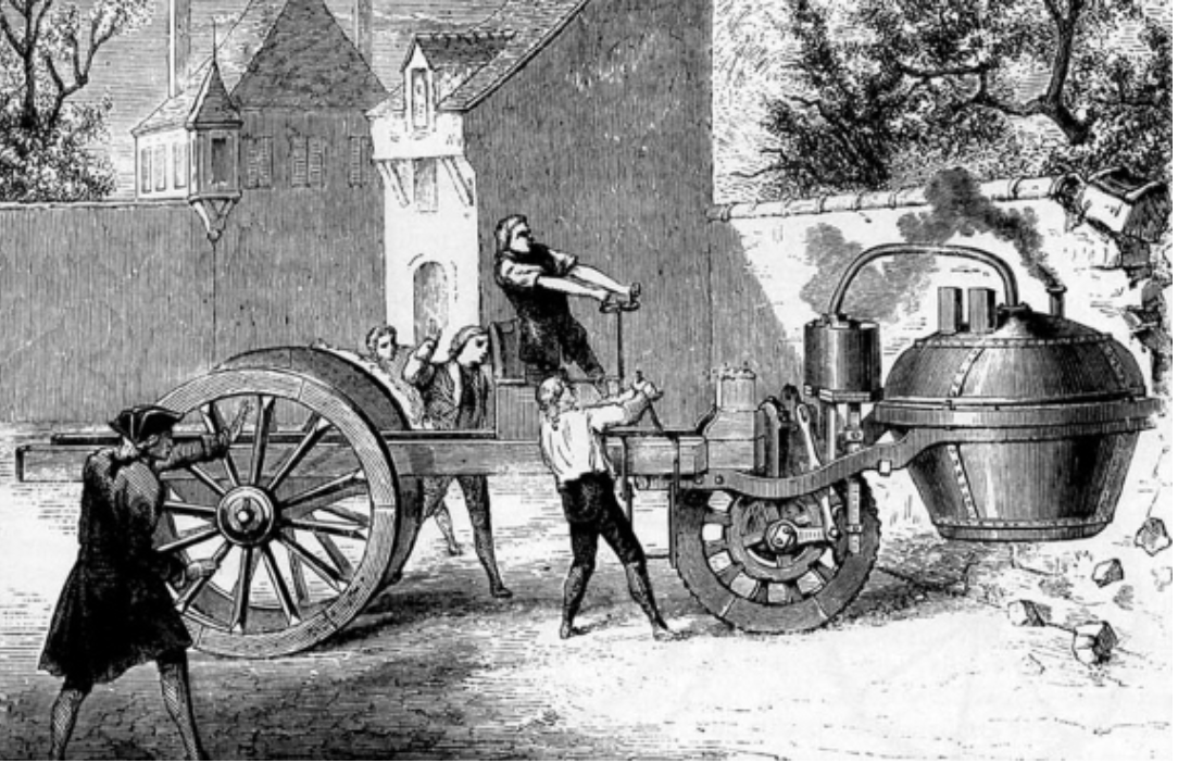 퀴뇨가 고안해낸 증기자동차의 구조를 잠시 살펴보자면, 사실 구조 자체는 꽤나 간단했습니다. 앞바퀴 하나와 뒷바퀴 두 개를 가진 삼륜차였으며, 조향 기능(진행 방향을 조절하는 운전장치.)을 갖춘 앞바퀴 쪽에 증기 엔진을 달아 거기에서 나온 힘으로 앞바퀴를 굴렸습니다. 2015년에 한창 유행한 전륜구동자동차의 효시로도 유명한 구조입니다.